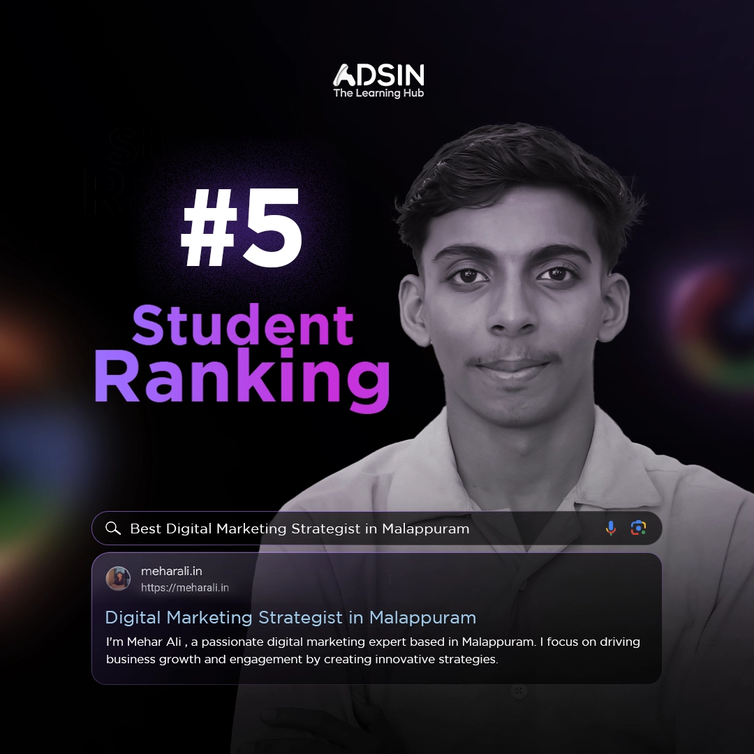 Mehar Ali, From Zero to Ranking #5 in Malappuram. Mehar Ali walked into Adsin Learning Hub with no prior knowledge of marketing, tech, or SEO. However, he was committed to mastering digital marketing and becoming a recognized  as digital marketing strategist in Malappuram. Mehar took every lesson to heart, focusing on targeting low competition local keywords, creating mobile-responsive websites, and writing content that answered common local business questions. His consistent efforts, including improving page load times and optimizing internal links, led to his site climbing to #5 on Google. For Mehar, this was just the beginning of a new career. His ranking on Google gave him the credibility to pursue opportunities in the digital marketing field.