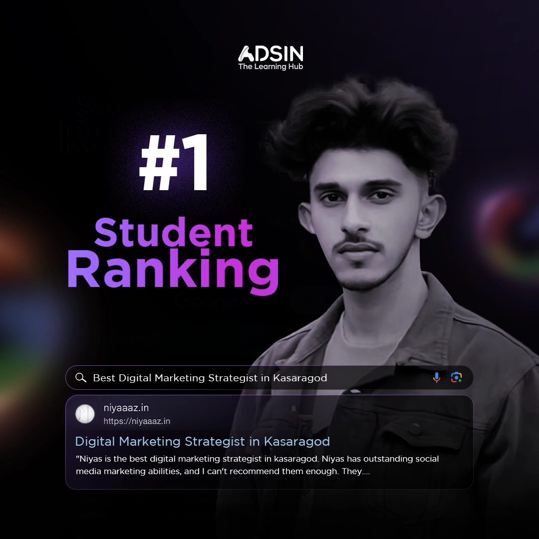 Niyas, From New Learner to #1 Digital Marketing Strategist in Kasaragod When Niyas first came to Adsin Learning Hub, his goal was clear: he didn’t just want to learn digital marketing, he wanted to rank #1 for his keyword in Kasaragod. Niyas quickly learned the essentials of SEO keyword research, on-page SEO and mobile optimization. What set him apart was his dedication to every detail: following instructions, implementing schema, and consistently optimizing his website. After just a few weeks, Niyas reached the top position on Google for his target keyword. His name is now the first result that appears when businesses in Kasaragod search for digital marketing assistance. What started as a class project became a powerful personal brand that attracts local clients.