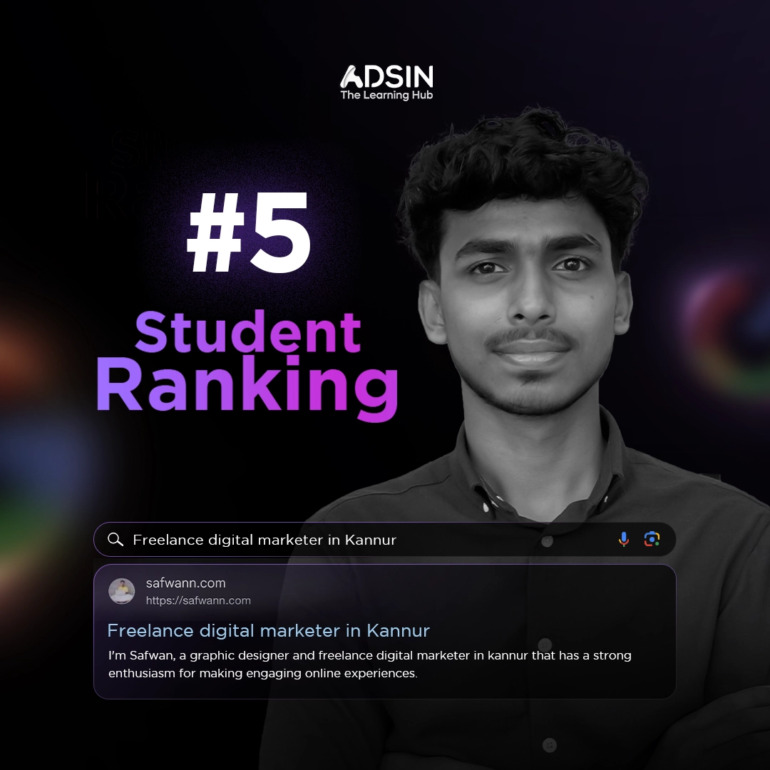 Safwan, Starting a Freelancing Career in Kannur. Safwan had a clear vision: to build a career in Kannur as a Freelance digital marketer in Kannur. To succeed, he knew he needed an online presence that would build trust with potential clients. Through Adsin Learning Hub’s freelancing-focused modules, Safwan learned how to create a personal brand, rank his website for local keywords, and optimize everything from backlinks to mobile usability. His hard work paid off as he reached a top 5 ranking on Google. Safwan’s website now receives genuine inquiries from businesses, and he’s on his way to building a thriving freelance career in digital marketing.