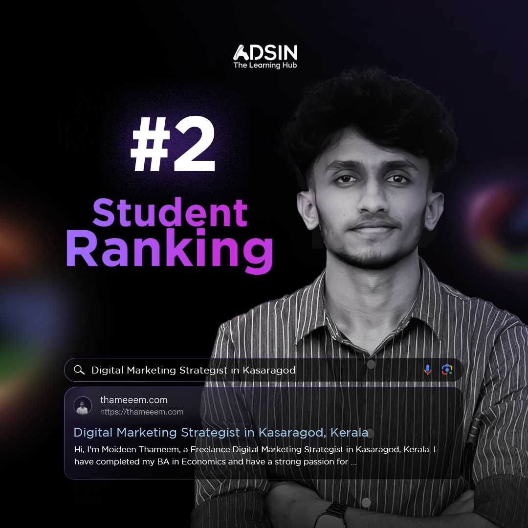 Thameem, Building a Strong Digital Marketing Presence in Kasaragod, Kerala Thameem began his journey at Adsin Learning Hub with one simple goal: to become recognized as a digital marketing strategist in Kasaragod, Kerala. Though he didn’t have a website or experience, he was driven to learn. Thameem focused on creating SEO-optimized content, structuring blog posts for better readability, and using WordPress to design a responsive, mobile-friendly site. Gradually, his hard work paid off as he ranked on the first page of Google for his chosen keyword. Today, Thameem uses his high Google ranking to attract freelance opportunities and local connections, building his brand as a trusted digital marketing strategist.